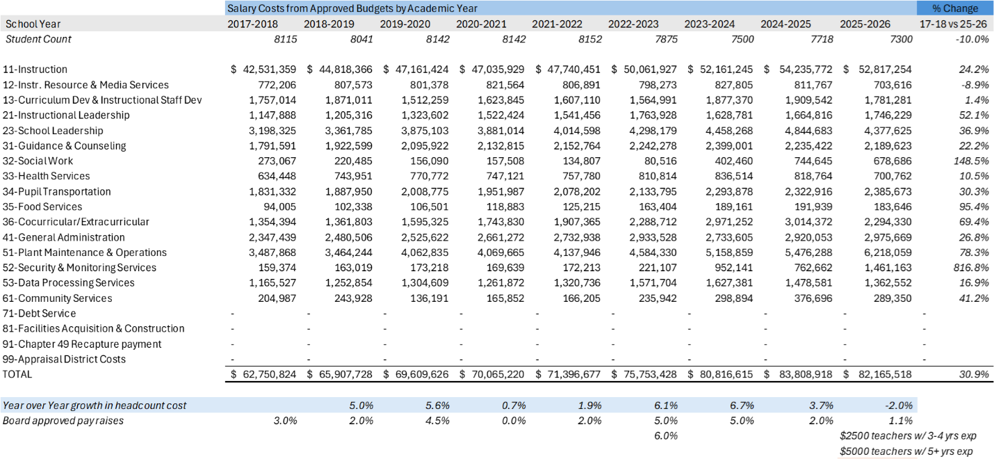 To keep this write-up clean and defensible, I pulled my data from publicly available sources, including district budget documents, board-approved compensation schedules, and local reporting on annual pay raises dating back to the 2017–2018 school year. I chose 2017–2018 because that was a school year not impacted by COVID-19. I then looked at every budget year since, up to the current budget for the 2025–2026 school year.