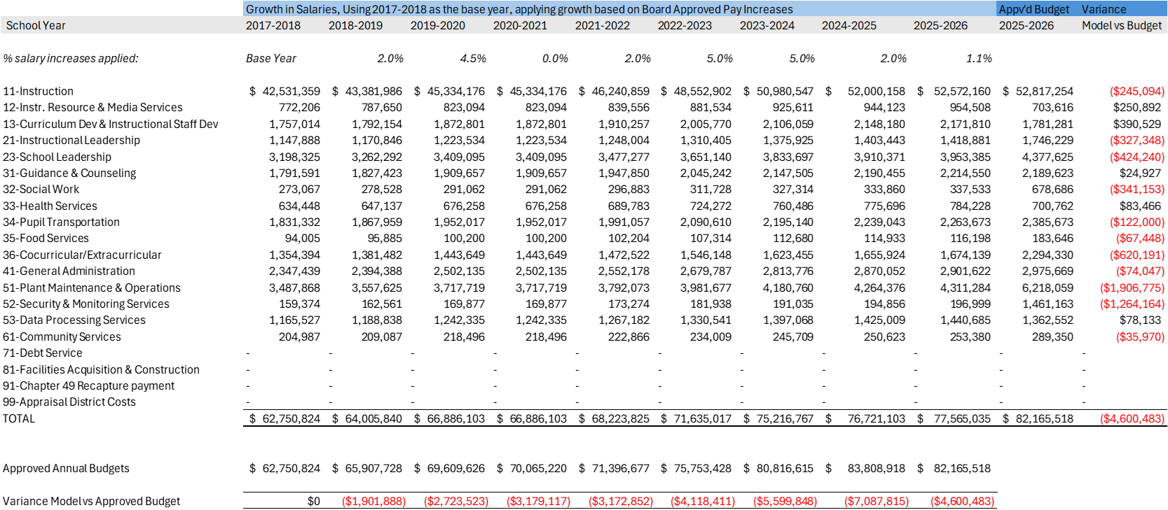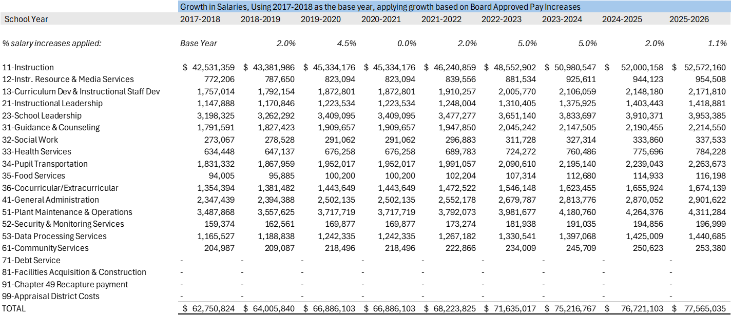 Stated differently: if we held the 2017–2018 staffing model constant and applied only approved raises year after year, what would payroll look like today? How does that compare to what we actually budgeted?