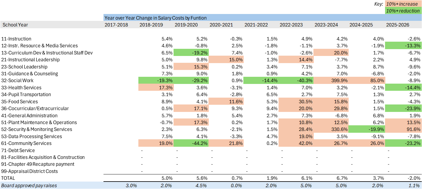 In the far right (last) column I calculated the change in salary costs from 2017–2018 to 2025 –2026. Scan your eyes down that column of percentages, and you will spot that some staffing costs grew, one area actually shrank, and some grew more than we might expect.